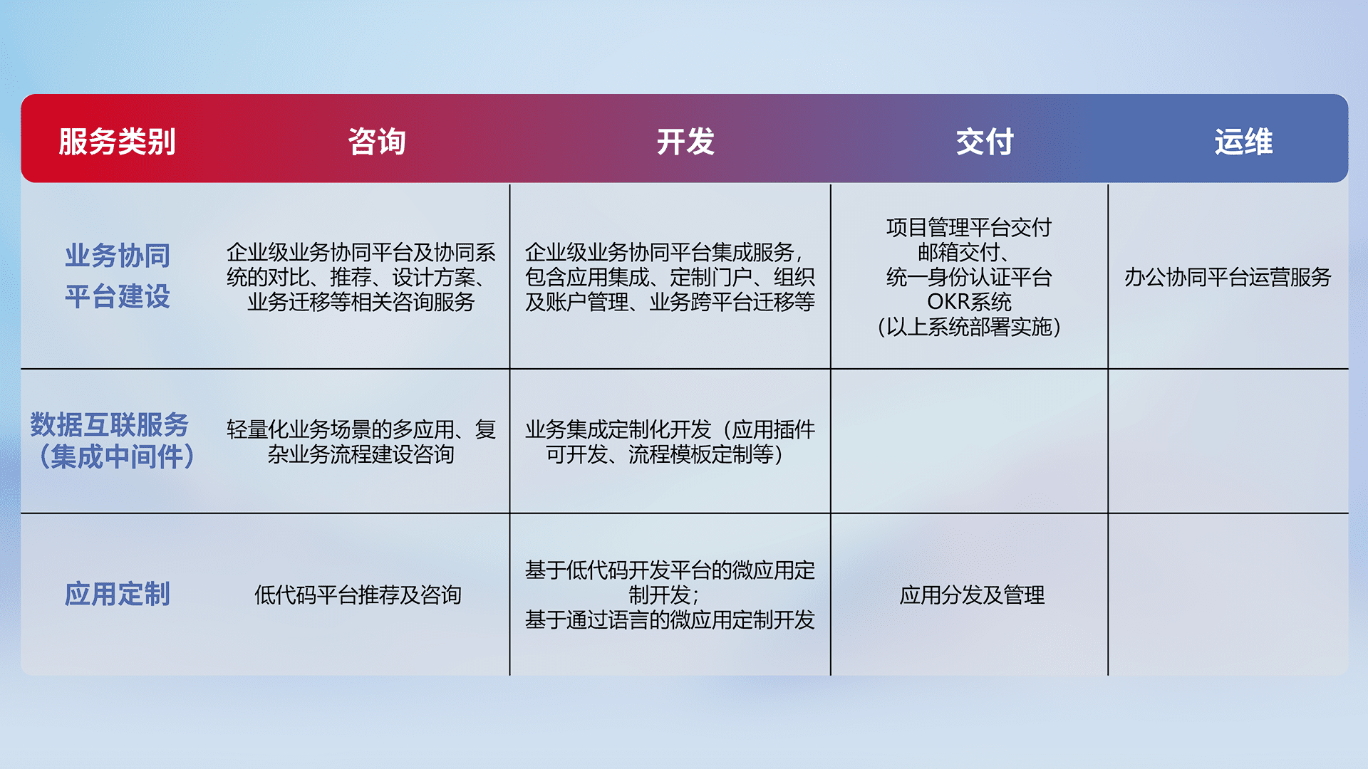 针对钉钉、、企微、、、IDaas等平台级产品提供产品的规划、、、方案、、交付、、定制化开发等服务,,,,实现如统一协同办公、、智能客户服务、、、、混合会议管理、、、智能数据查询、、、、等业务场景,,,,实现数字化转型。。
